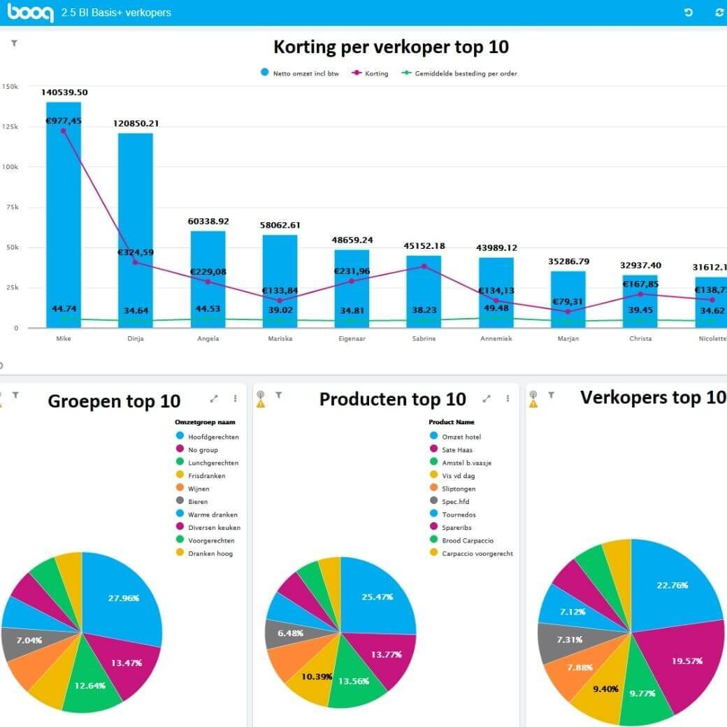 In the current DISH Backoffice, you already find clear reports. But DISH BI takes a big step further and makes the translation from data to useful information for you in clear tiles with graphs and tables. Want to compare periods and locations? You can! An overview of your biggest revenue drivers, and how they differ by day and period? No problem. Or want to see how many bottles of house wine each employee sold in a specific timeframe? Also possible! This gives you tools to improve your menu and your team’s performance.